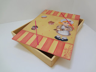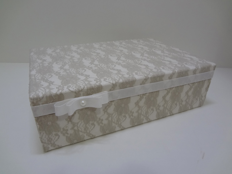 Esse porta jóias em MDF foi forrado com renda e tem alguns detalhes de pintura.